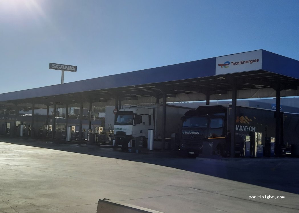 Grandes stations-service pour camions avec places de parking. Nous avons vu ces machines à laver par hasard. C'est rare que tout soit occupé ici.