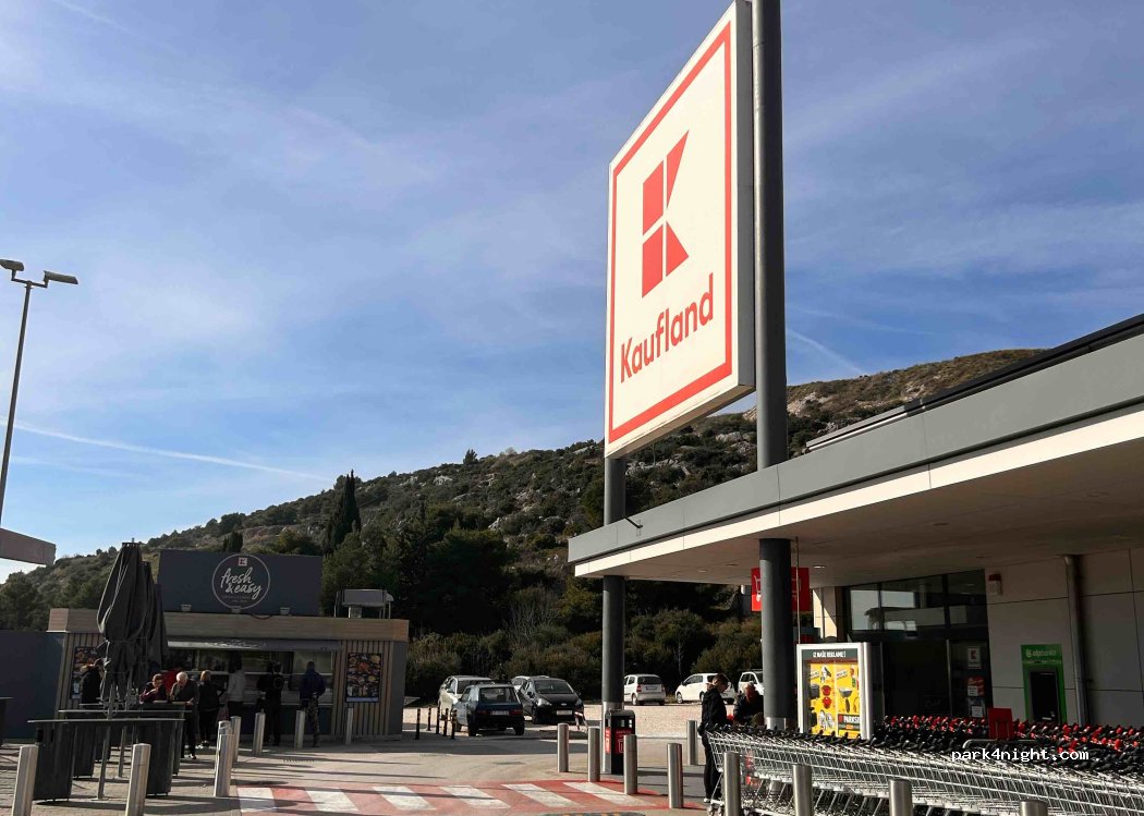 10 plazas de aparcamiento muy amplias junto al supermercado Kaufland. Al otro lado de la calle también hay un Lidl. En el supermercado hay una máquina de café de 50 céntimos. Afuera, en el parking hay un snack bar del supermercado que vende hamburguesas y pollo, ¡muy baratos!