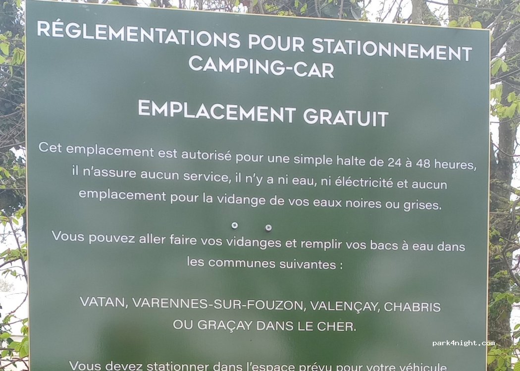 Endroit super tranquille pour une étape nocturne reposante à quelques kilomètres du château de Valencay et de Bouges le château accessibles à vélo par petite route. Super randos dans Forêt de la Vernusse à quelques minutes. Très beaux légumes de saison et bons produits locaux à acheter sur place 24/24 h. Merci à M. Riguet pour ce petit parking