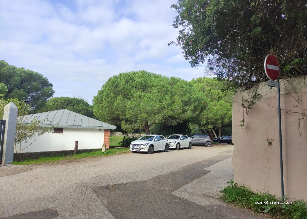 Es un parking de un polideportivo, hay una señal de prohibido en lo más cercano al pinar. Aparcamos en el parking asfaltado de delante y ni tan mal. Alguna ambulancia y tráfico cercano pero pasamos la noche tranquila y solos. Sacamos mesas y sillas y nadie nos dijo nada ni vino policía. Pasamos una noche aquí. Por la mañana si vienen muchos coches al polideportivo.