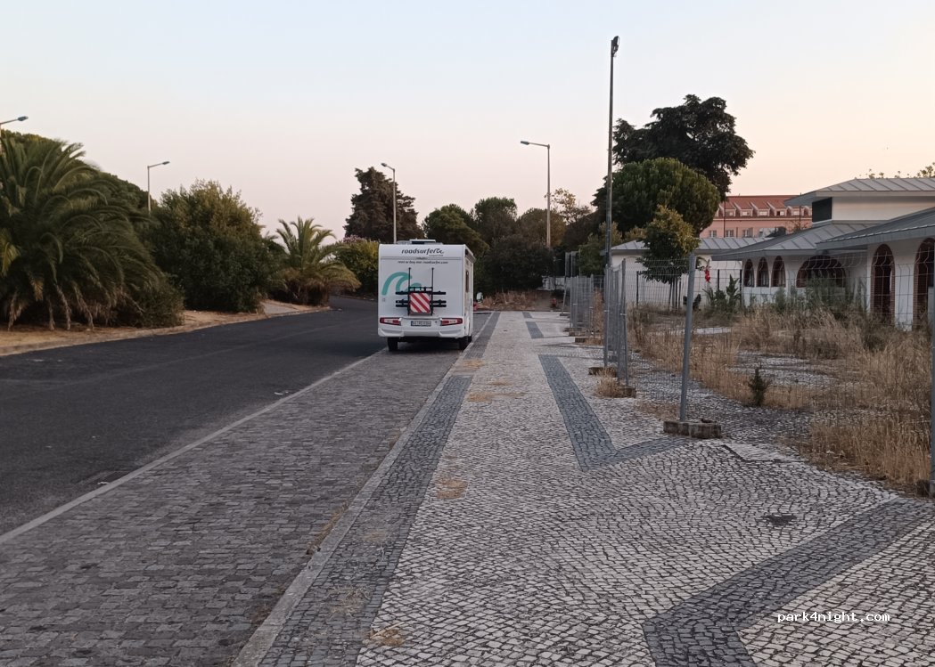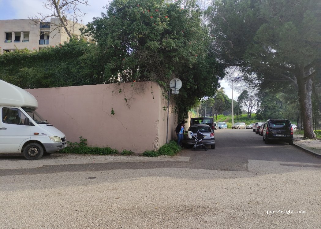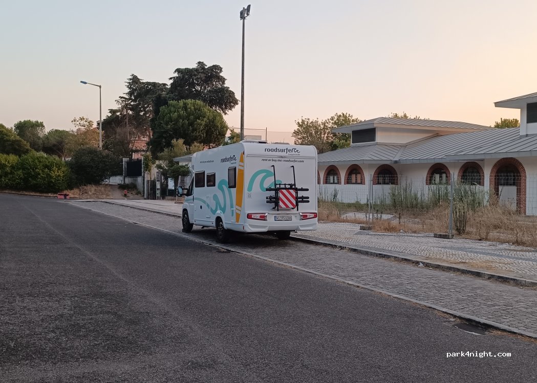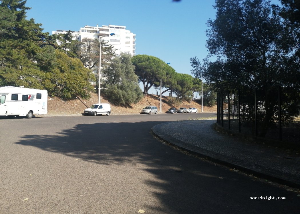 Aparcamiento gratuito sin servicios. Bien nivelado. Junto a un polideportivo y un parque. Frente a una BP y un MC Donald. De día bastantes coches pero por la noche estuvimos solos. Por la noche los aparcamientos iluminados por farolas y un guarda en el parque. Dormimos dos noches y dejamos la AC aquí para visitar Lisboa. Uber al centro 8€.