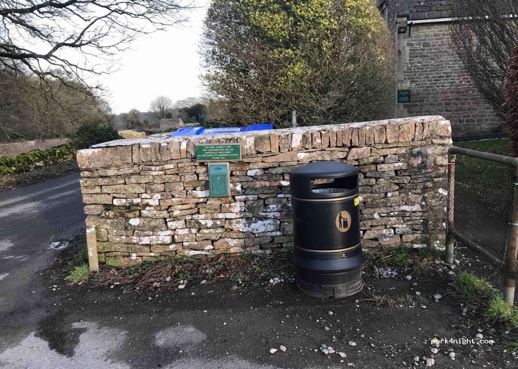 Le parking scolaire est utilisable les week-ends et pendant les vacances scolaires. Une boîte d'honnêteté pour aider à financer les écoles est accrochée au mur. Assez plat. Courte promenade le long de la route menant au pub, sentier pour promenades en face. Le parking se trouve juste devant l'entrée de l'école. Camping-cars petits à moyens uniquement.