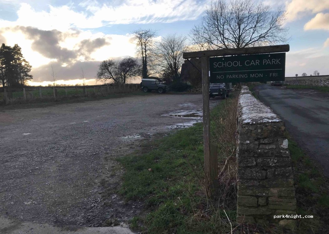 School car park can be used at weekends and school holidays. An honesty box to help school funds is on the wall. Fairly flat. Short walk along road to pub, footpath for walks opposite. Car park is just beyond school entrance. Small to medium motor homes only.