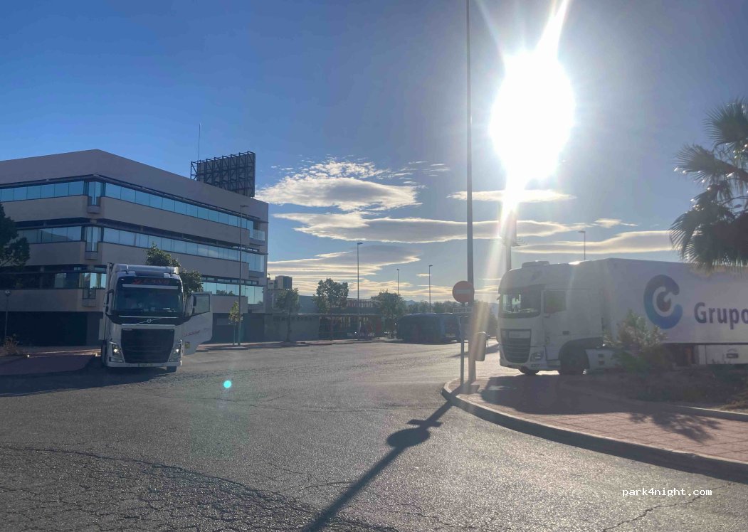 Aire de repos des camionneurs avec cafétéria, restaurant et station-service. Parking plat avec gravier. Un agent de sécurité du quartier nous a dit de passer la nuit.