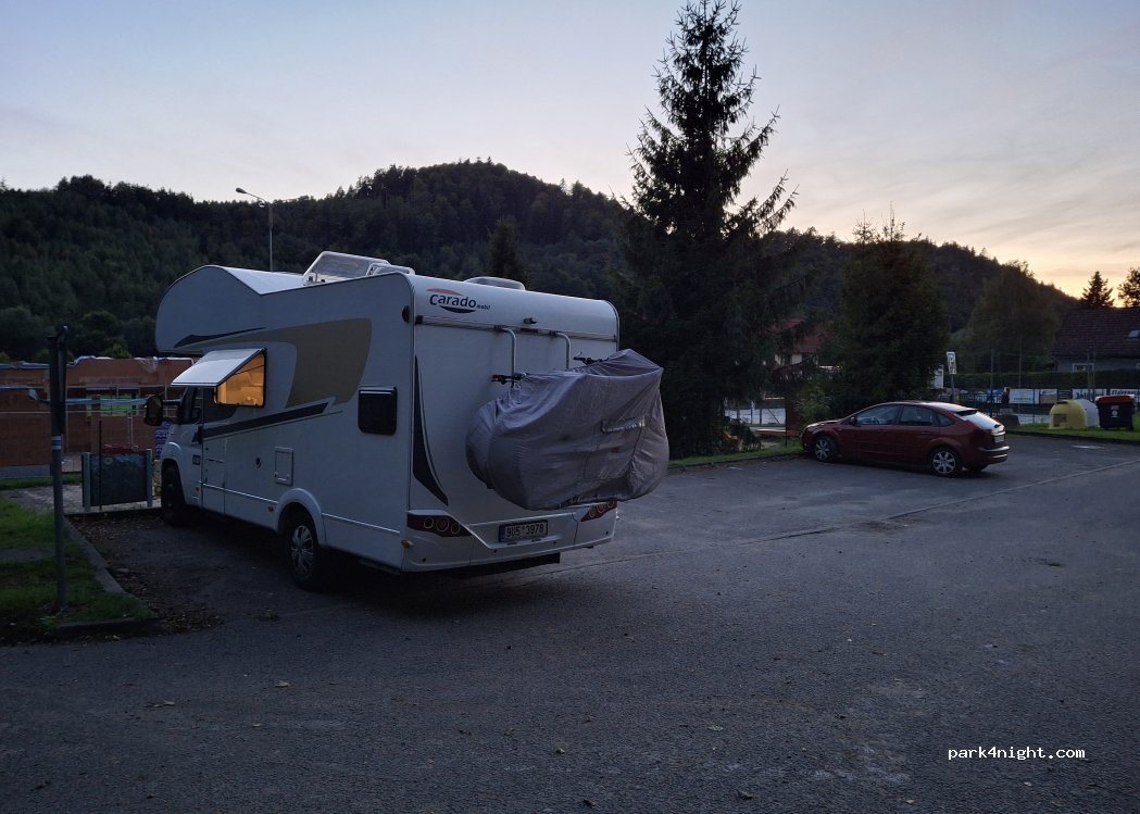 pěkné parkoviště,v pohodě přespání, jen pár lidí šlo kolem na hřiště