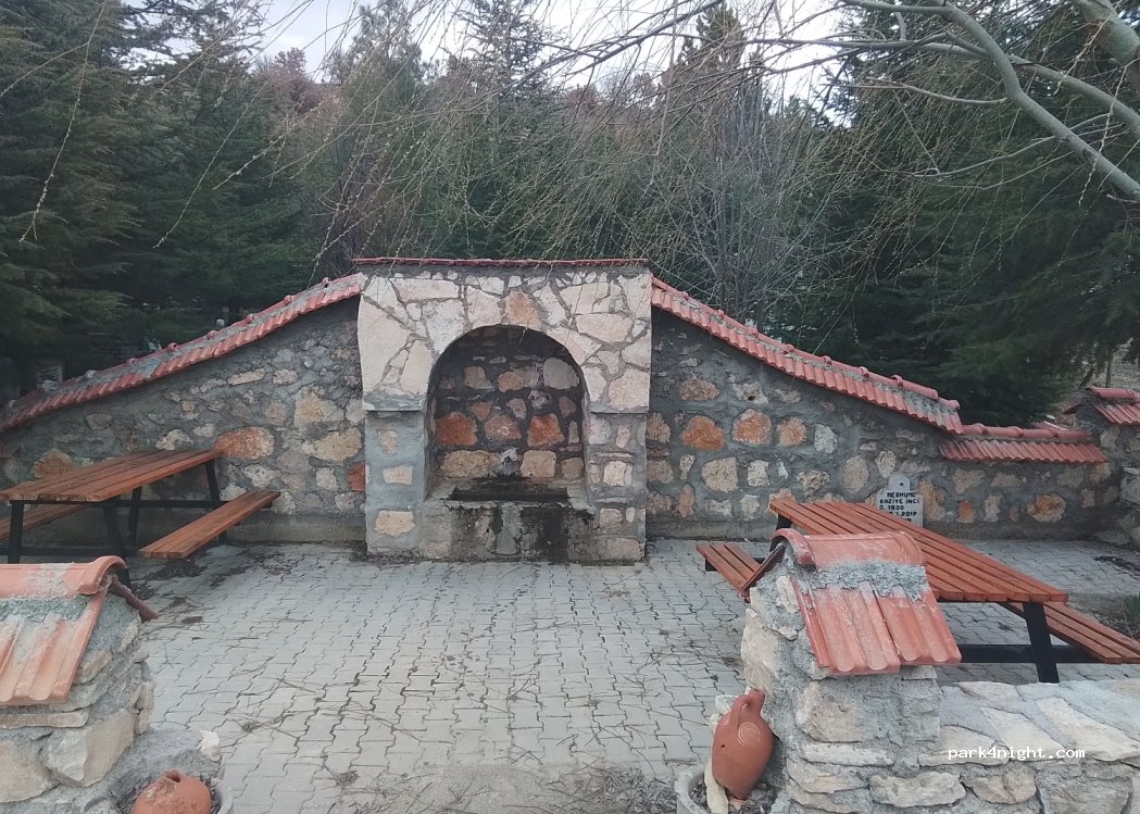 Kleine Rastanlage vor einem Friedhof mit fünf festen Tischen und WC plus Wasserstelle mit Hahn, Schlauchanschluss und gutem Druck (13-03-2024)
