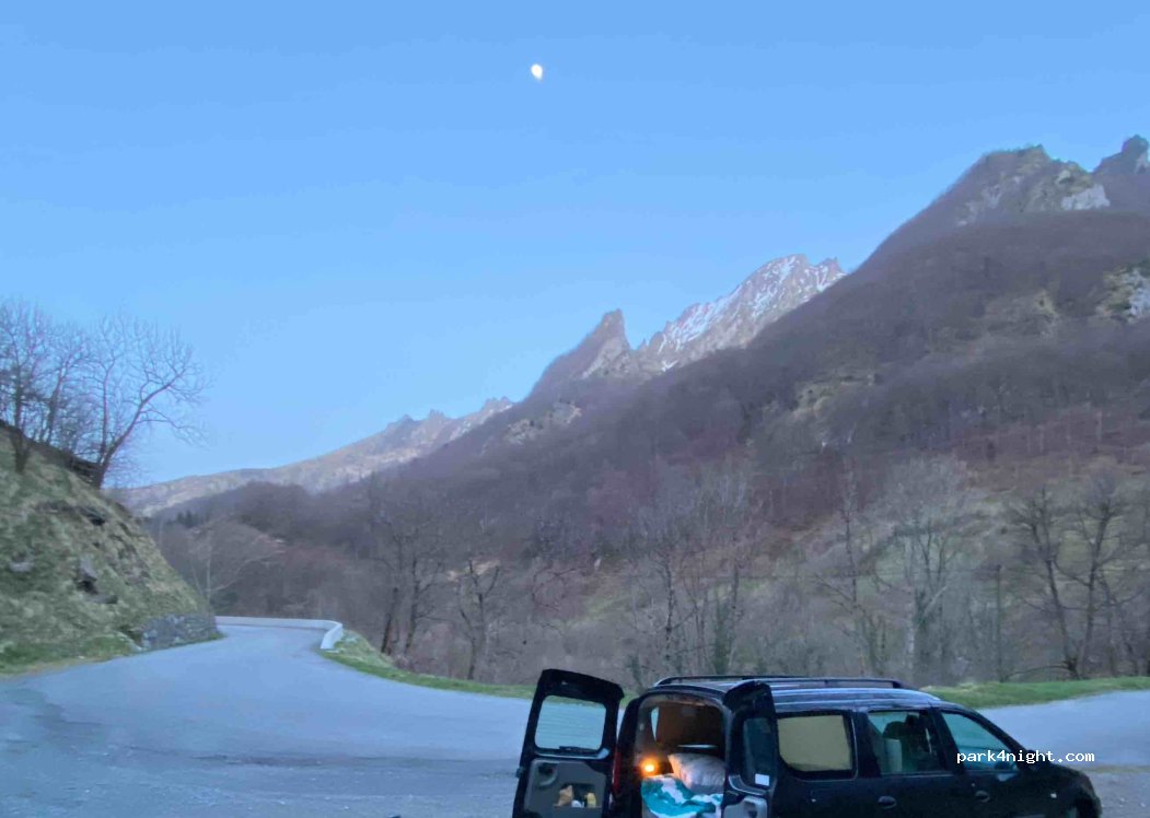 Parking en bord de route, j'ai passé la nuit ici, je n'ai pas été dérangé. Route pour aller au barrage de Tech et au lac Suyen. Un ruisseau qui passe fait un peu de bruit mais pas dérangeant.