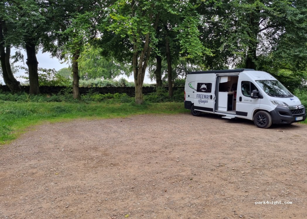 Delightful place surrounded by trees. Flat parking, for 10 cars, or a few campers. Totally quiet. A few hikers arrived around 9am. A sign saying there is CCTV. No prohibition signs against sleeping overnight. No services, no bins, decent phone signal.