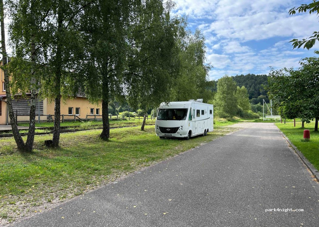 Beau parking bien plat hyper tranquile .Nous sommes seuls. Pratique pour aller voir le château de Falkenstein en 50 mins à pied par sentier le long de l’ancienne voie ferrée côté mairie .Le château vaut le détour.