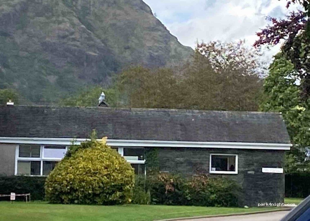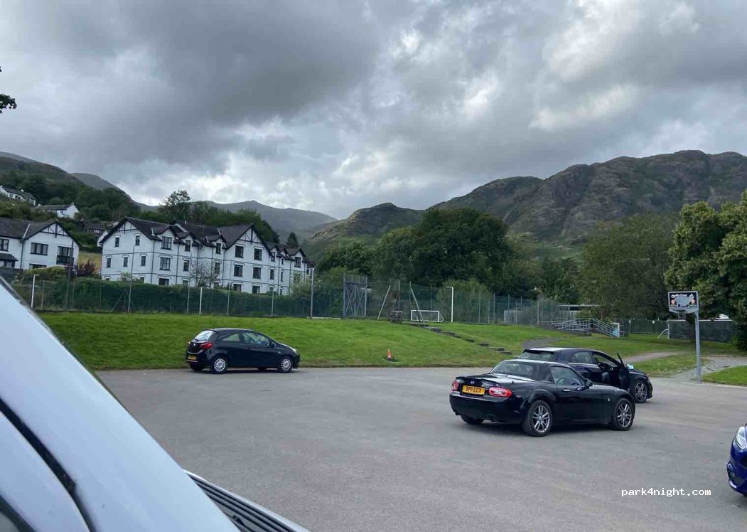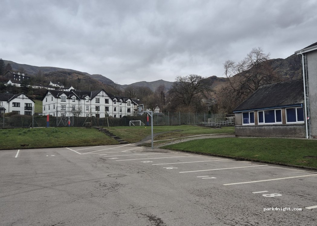 Large flat carpark behind school.Superb place to stay. 5 minutes walk to the lake & the village.Beautiful walks along the river (with waterfalls)to the Copper Mine.Worth visiting the John Ruskin museum to see & learn about Bluebird & John Campbell.Great idea for the school to raise funds.£15 gives you more than 24 hours.Thank you