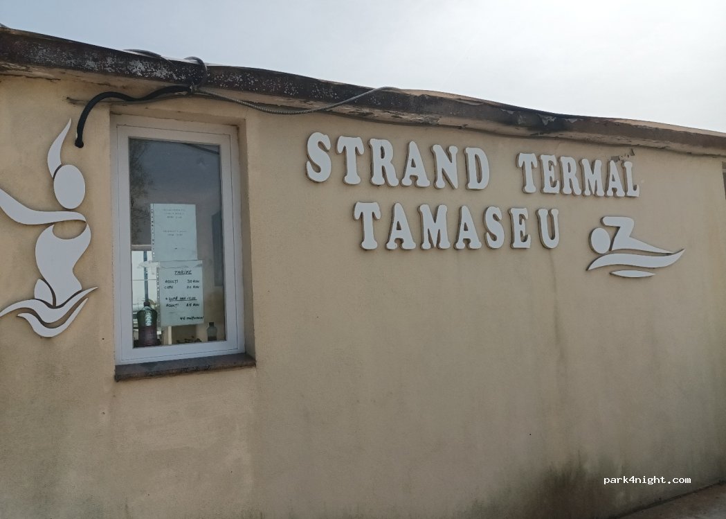 It is the free parking lot of the Tămășeu thermal beach. The parking is in a quiet area with trees and lots of well-kept greenery. The beach is small, cute, very clean with 4 pools. One with thermal water at 37-38 C° a freshwater pool heated to 31-33 C° a small pool for small children, and a pool for swimming. Next to the pools is a large manicured green area with plenty of sunbeds. The owners and employees are very kind and welcoming. There is a restaurant on the premises of the beach with tasty food at a reasonable price. Entrance to the beach is 30 lei (approx. 6€) for adults and 20 lei (approx. 4€) for children. We stayed for 3 days and felt very good!