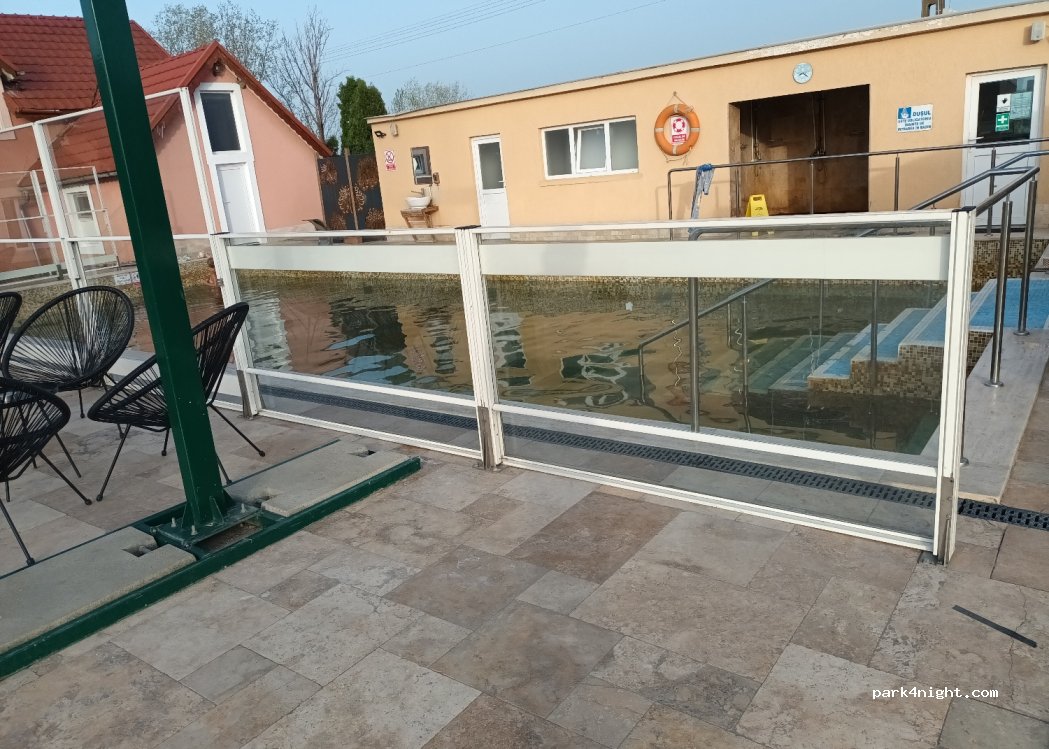 Excellent place to stay for the night very quiet and safe. We went into the thermal pools for the day €5 from 9am to 8 pm. The cafe had a variety of food and drinks with most drinks being 8 Lei. Pools toilets showers and grass area all very clean