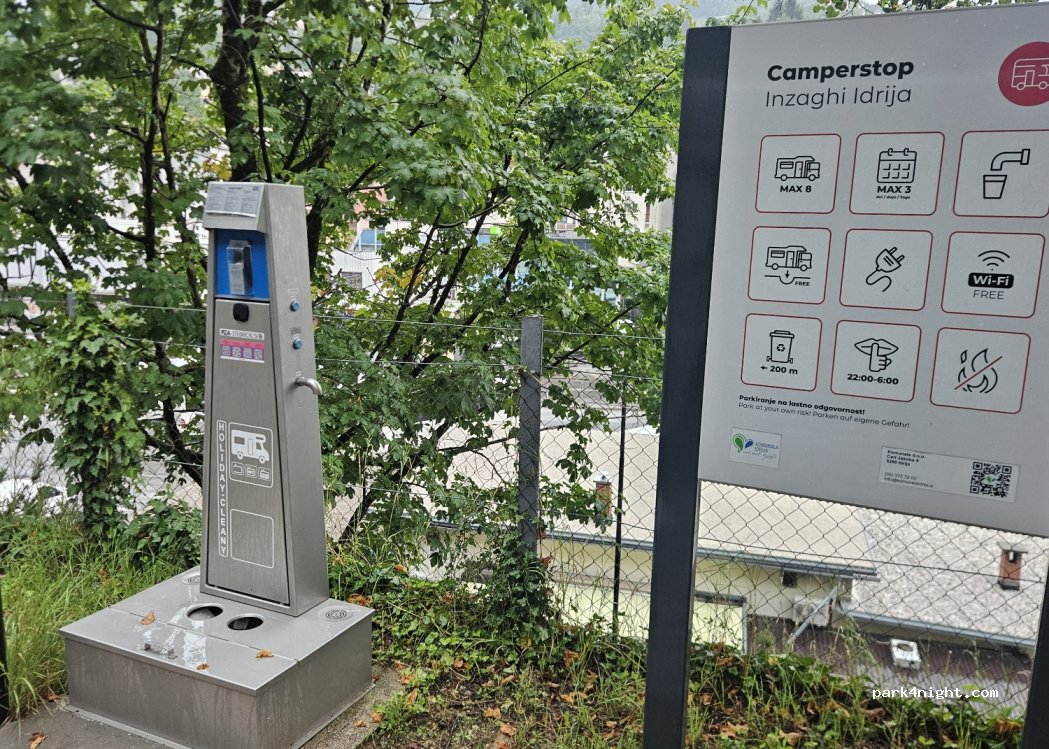 Ottimo servizio comunale. Comodo accesso anche per camper di grandi dimensioni. Scarico wc e acque grigie funzionanti. Non era disponibile la ricarica acqua. Comodissimo per visitare la miniera e la cittadina di Idrija con parcheggio adiacente gratuito.