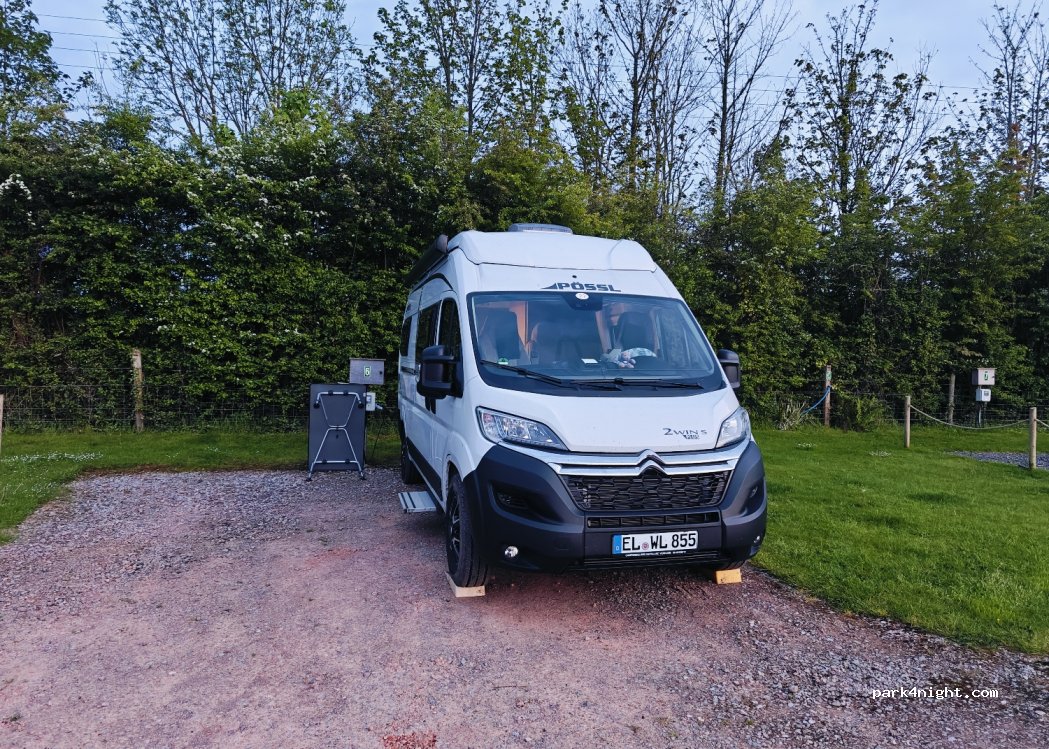 Large hard standing pitches, with benches / tables in front of each pitch. Water and electricity on each pitch. Facilities clean, extra charge for shower. Main road close by but wasn’t too noisy.