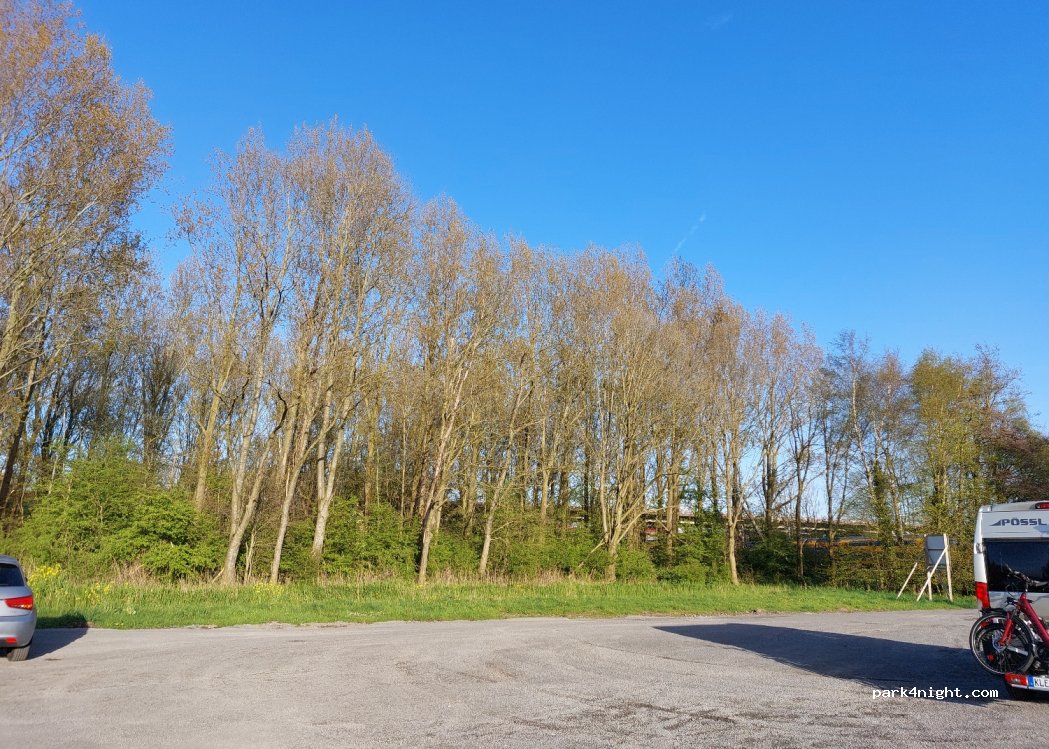 Gravel parking space. There is a bench. Cycle path, railway line and viaduct in the immediate vicinity, so there was some noise when we were here during the day.