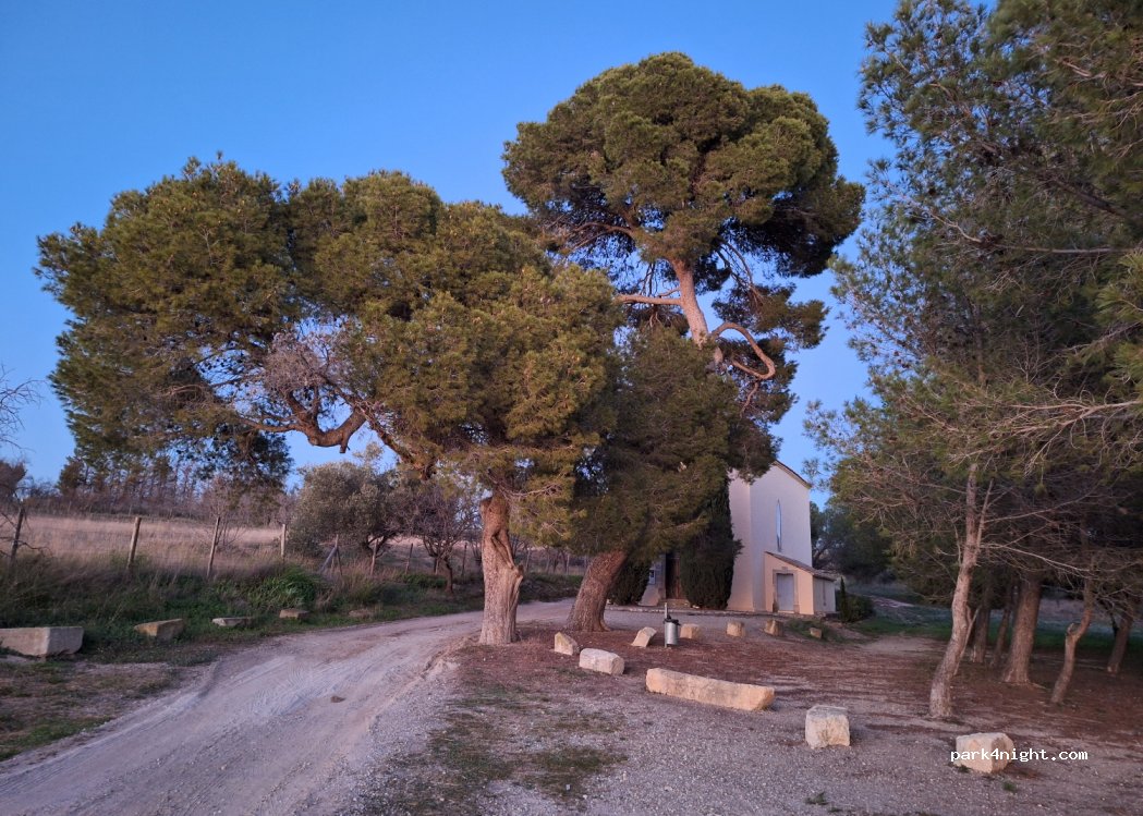 lieu sympas avec balade autour parking facile calme ( si ce n'est un fond au loin d'aboiement de chiens ) nous avons passé une excellente nuit. l'accès et facile pour n'importe quel camper. poubelle près de la chapelle. si en effet il n'y a pas d'eau ni d'électricité il y a le but recherché. le CALME au milieu des vignes et Oliviers . À voir en belle saison ? Où au moment des vendanges ?