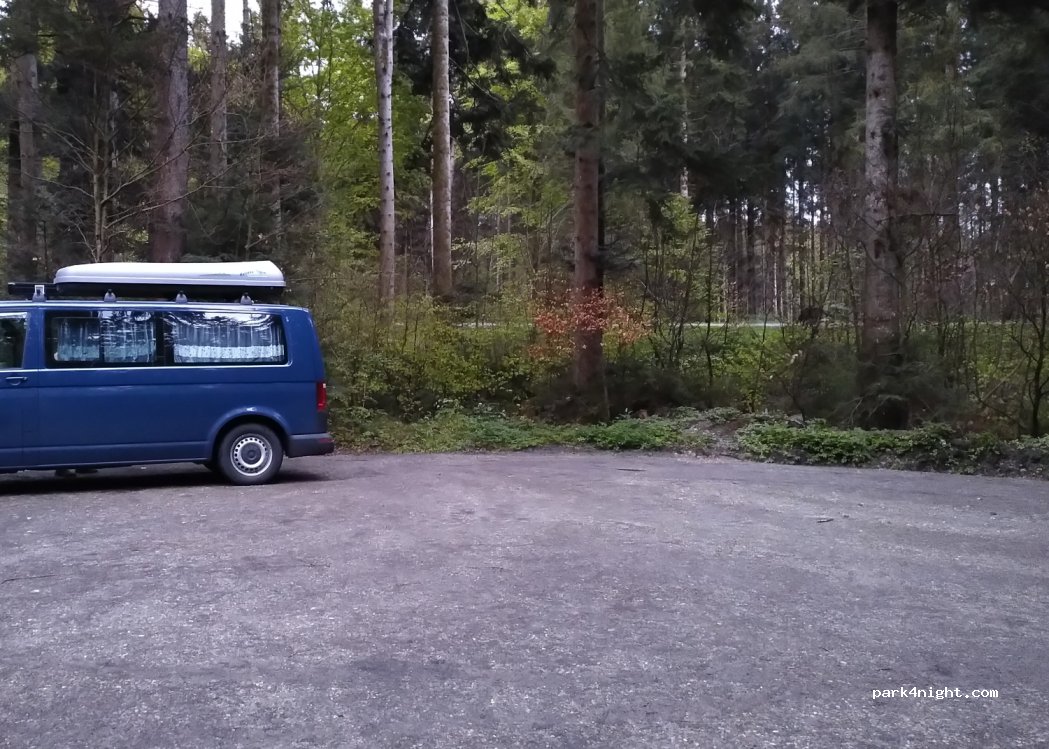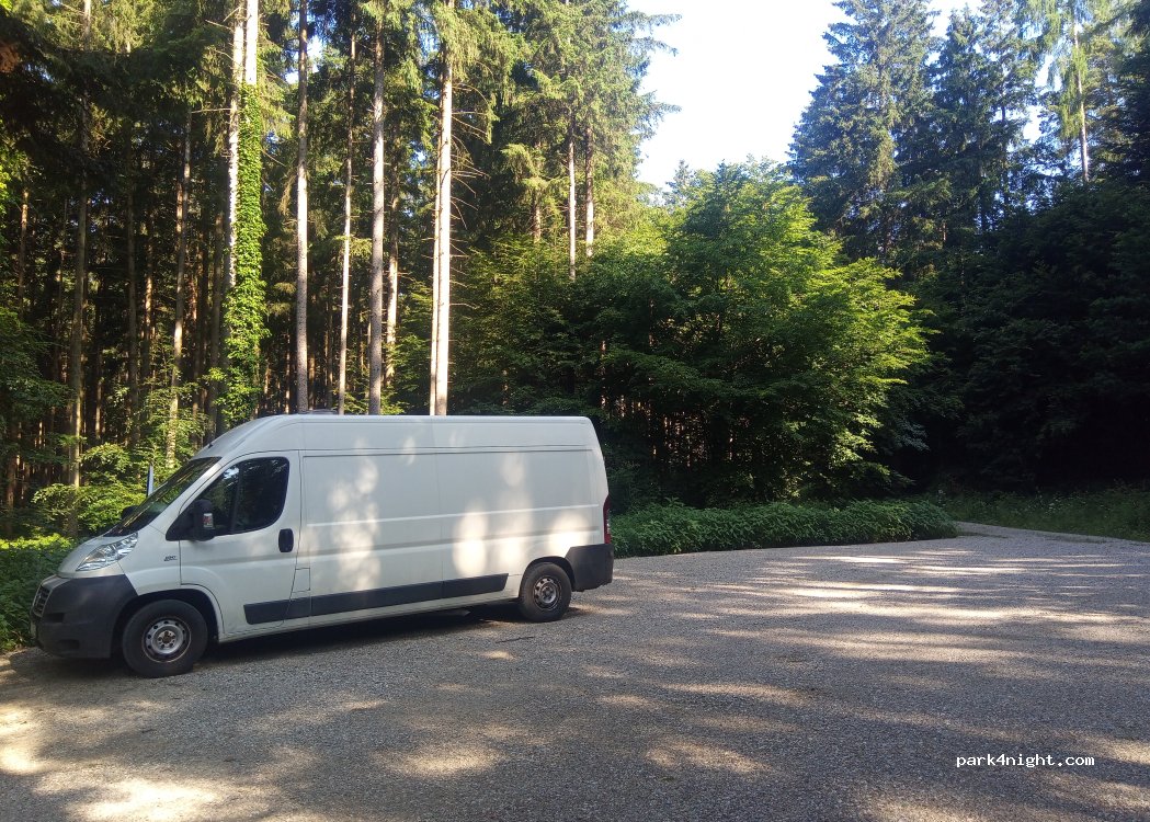 Ein kleiner Parkplatz, umgeben von Bäumen, gleich neben der Straße. Bis 22 Uhr nur wenig Lärm, in der Nacht sehr ruhig, ab 6 Uhr ziemlich laut. Vermutlich aber nur an Werktagen.