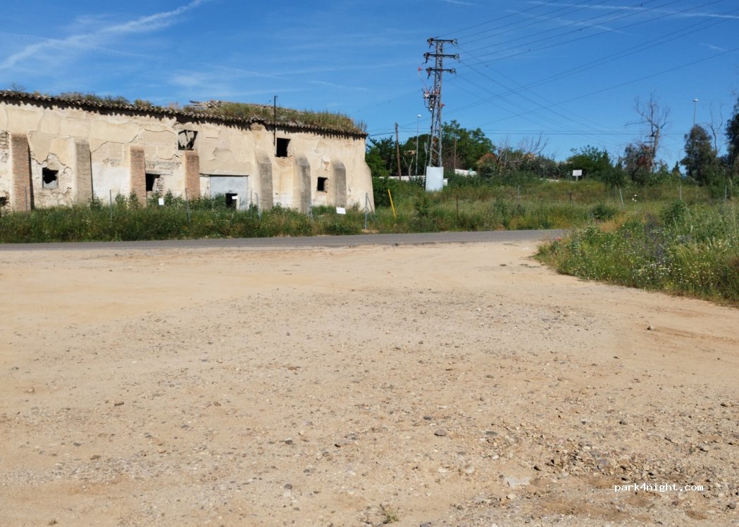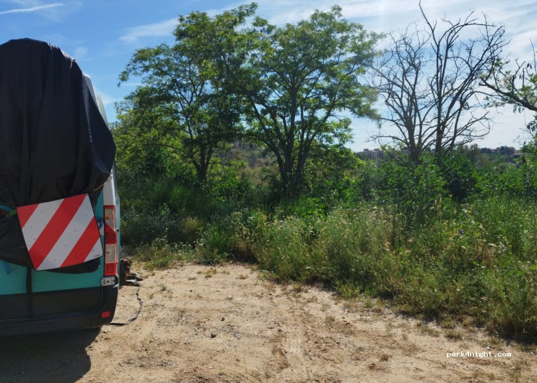 Après avoir essayé plusieurs parkings encombrés, trop pentus, difficiles d'accès, nous sommes arrivés ici. Actuellement il n'y a qu'une place disponible, plusieurs monticules de terre encombrent les autres. Plat, tranquille, un chemin piétonnier le long du Tage mène à Tolède en 3 km. Permet une bonne promenade toutou Inconvénient puisqu'il a plu toute la nuit, c'est un peu boueux au petit matin.