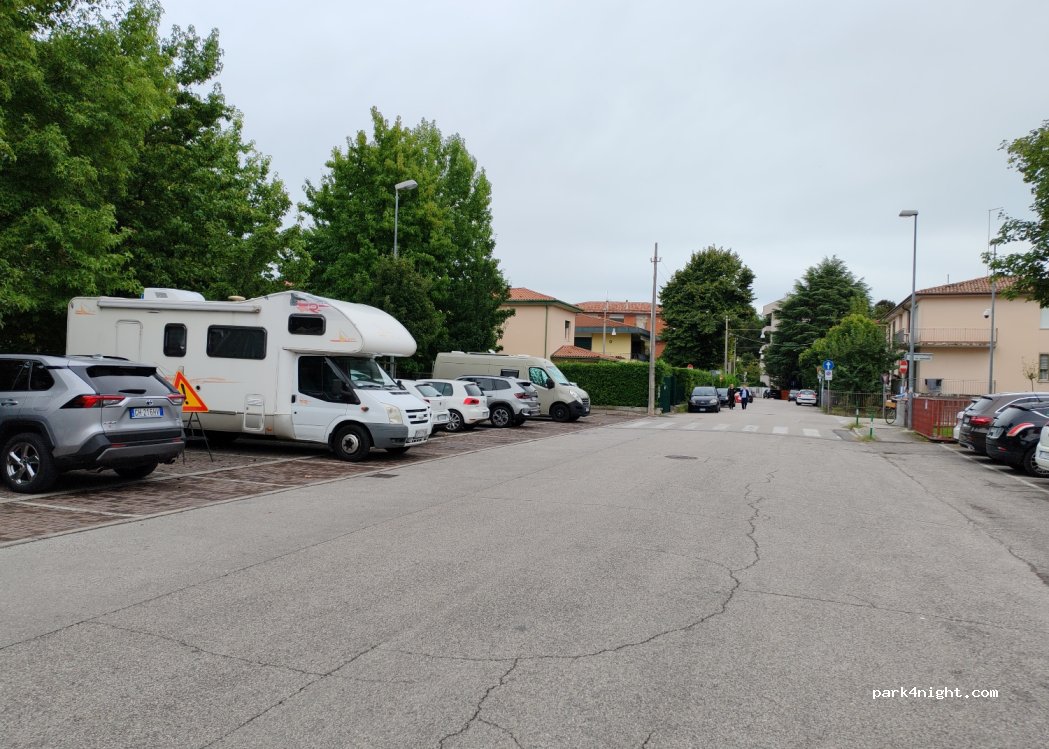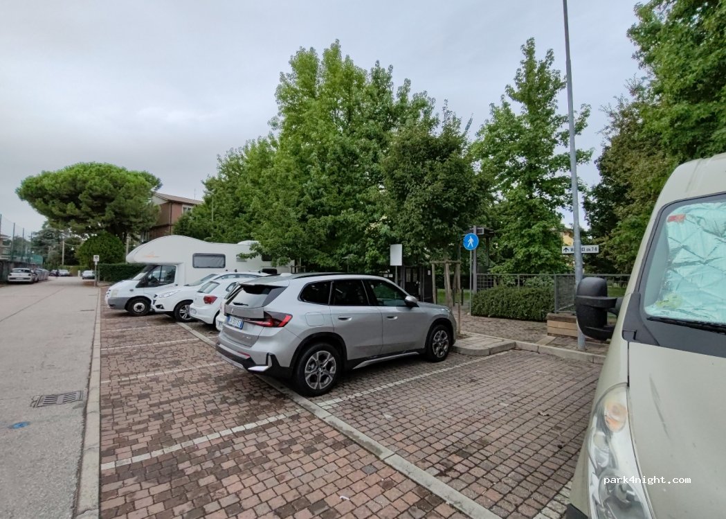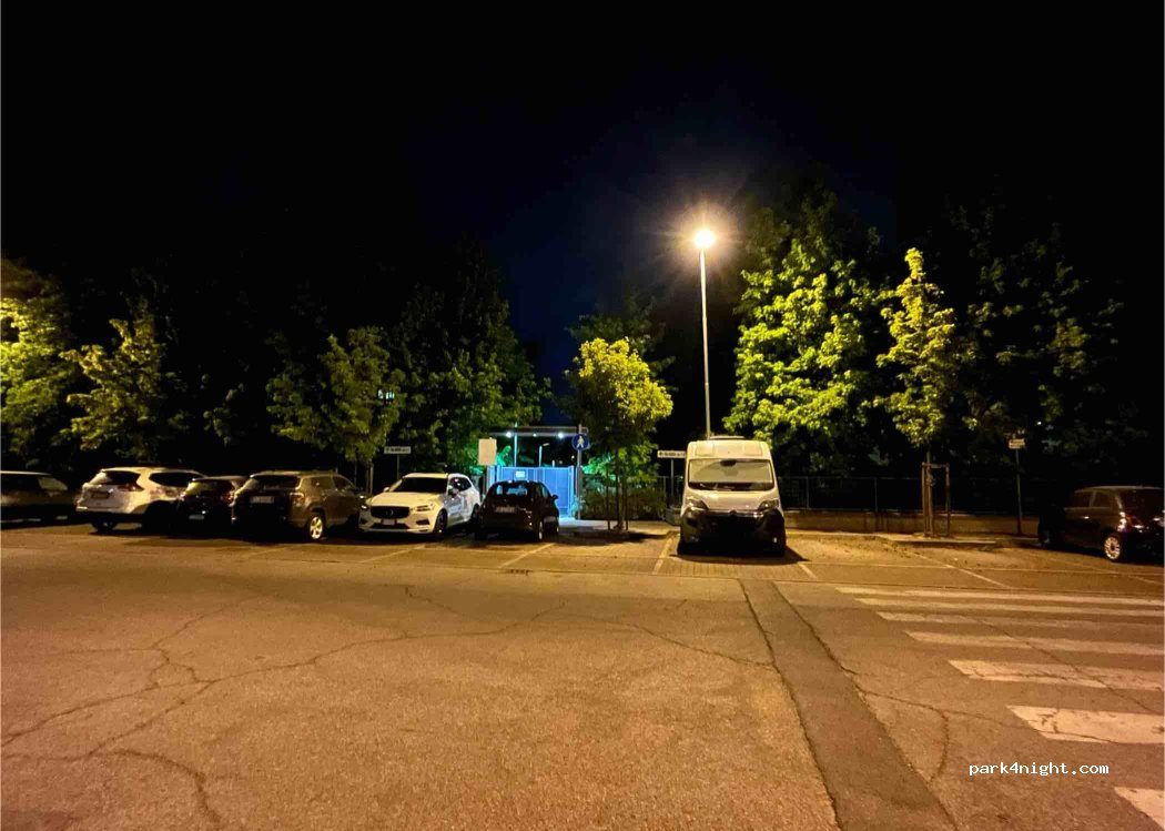 Free parking spaces for vans. Too narrow for CC. On the edge of Giochi Magnolia Park via Giambattista Verci. The park side spaces are wider and some longer for 6m vehicles. 20’ walk from the tourist center. Trash cans 50 meters away, bar and laundromat 300 meters away. The park closes at night so it’s a very quiet place to spend the night. Very little entertainment during the day. It is best to arrive at the end of the evening as there are more free places. On the other side of the park there is also a parking lot to see!