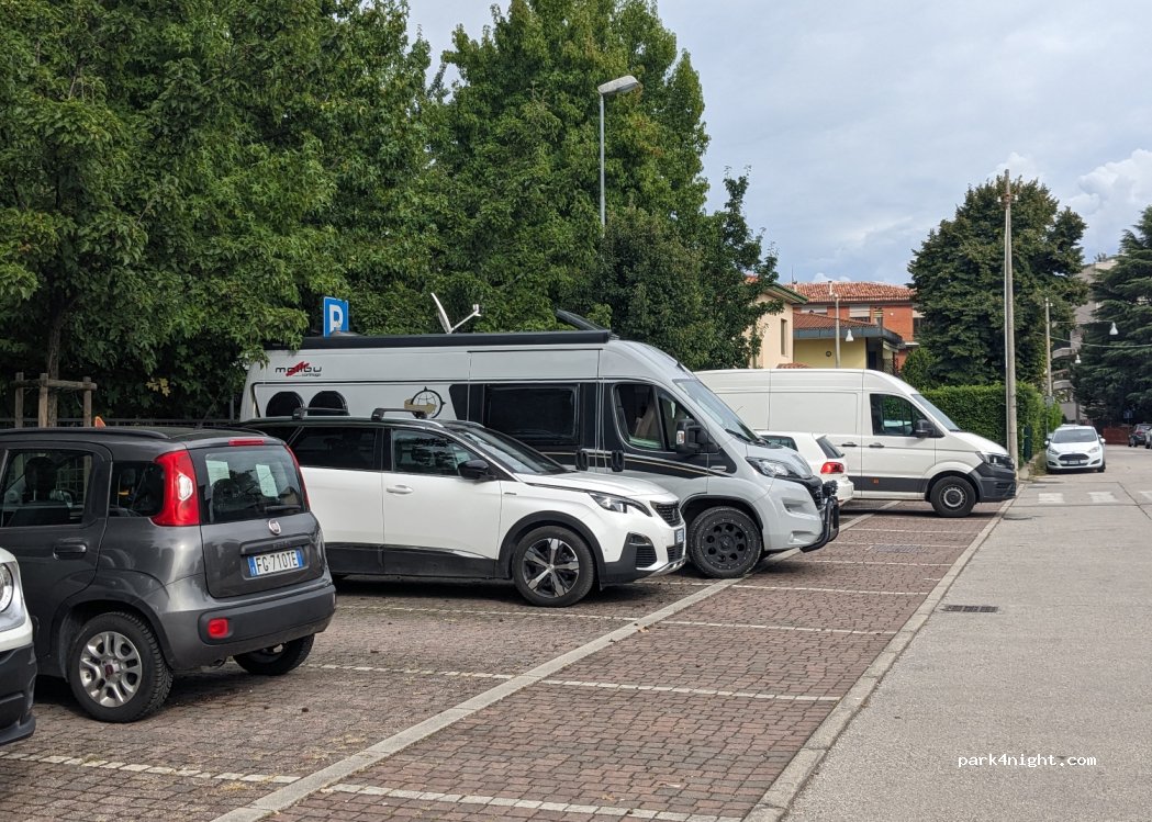 Parcheggi gratuiti per furgoni. Troppo stretto per CC. Ai margini del Parco Giochi Magnolia via Giambattista Verci. Gli spazi laterali al parco sono più ampi e alcuni più lunghi per veicoli da 6 metri. 20’ a piedi dal centro turistico. Bidoni della spazzatura a 50 metri, bar e lavanderia a 300 metri. Il parco chiude di notte quindi è un posto molto tranquillo dove passare la notte. Pochissima animazione durante il giorno. È meglio arrivare a fine serata perché ci sono più posti liberi. Dall'altra parte del parco c'è anche un parcheggio da vedere!