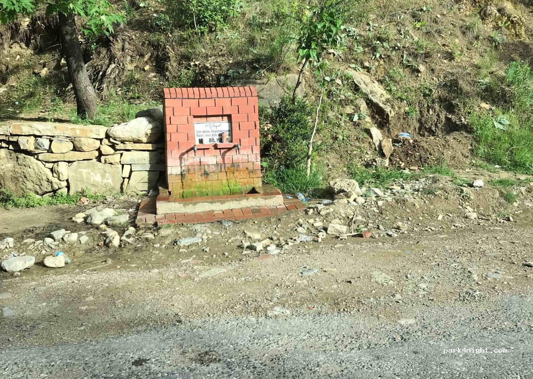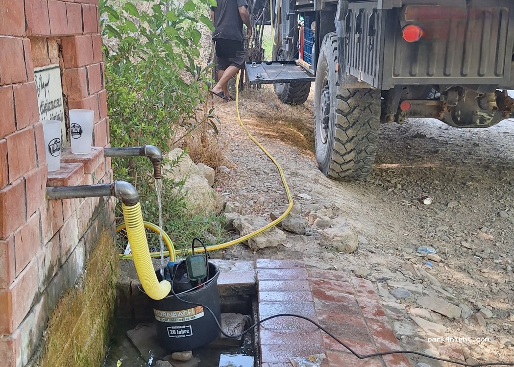 Frisches Wasser am Straßenrand. Wenig Verkehr. Gut zu halten/parken zum Auffüllen.
