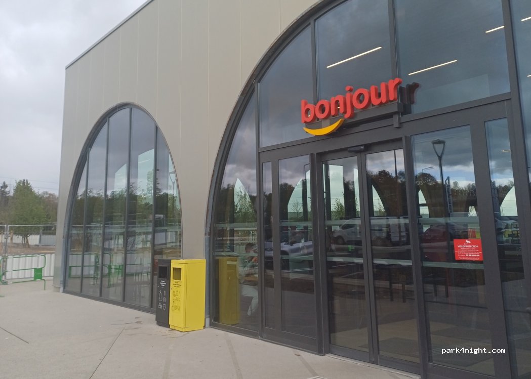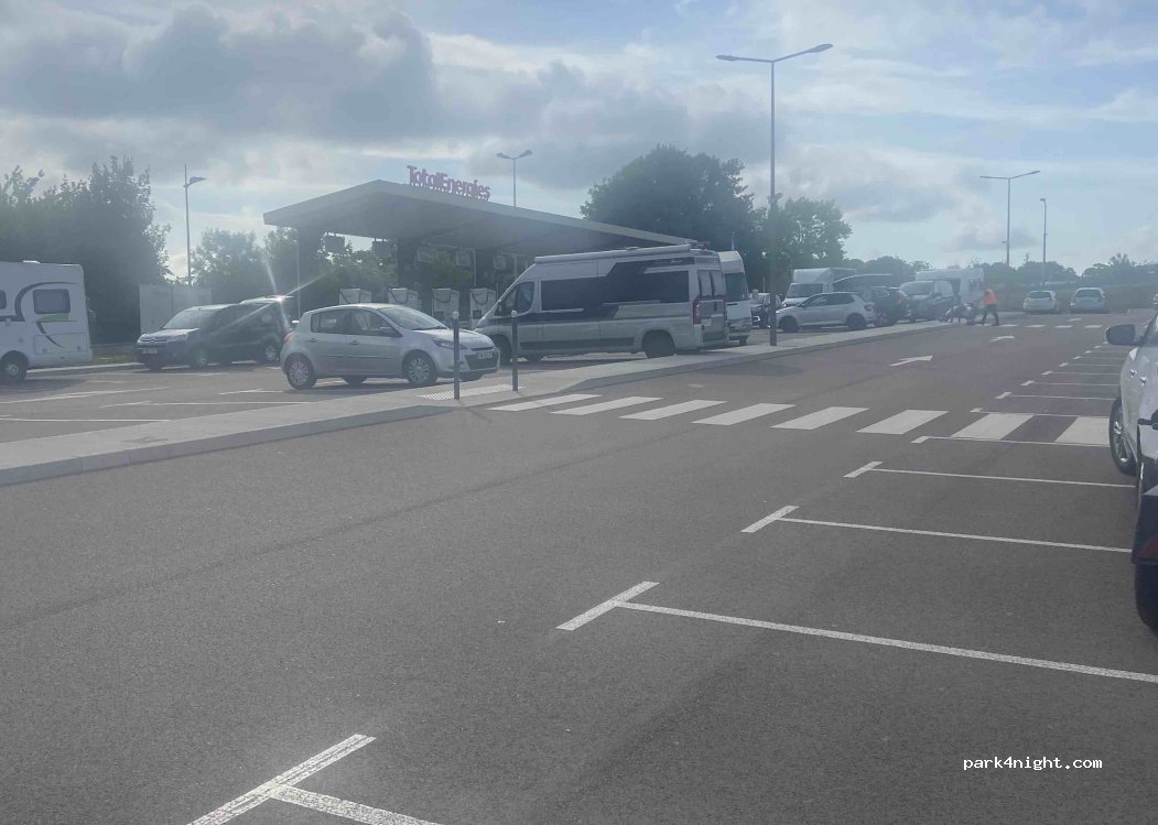 Modern paege service station stop over. Is rather rambling and did not find service point. Able to park in car area so reasonably quiet and flat. Clean and maintained toilet area, with shops for snacks, coffee or more. Good for a stop over to break up a journey.