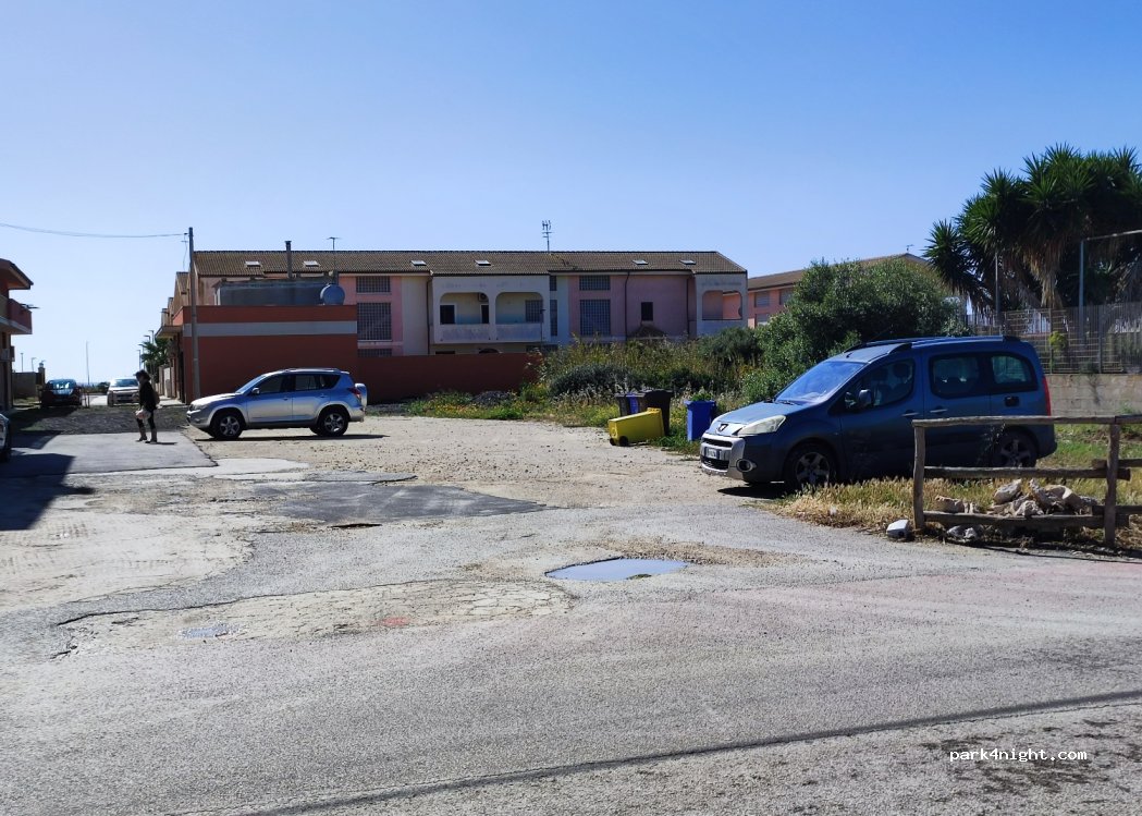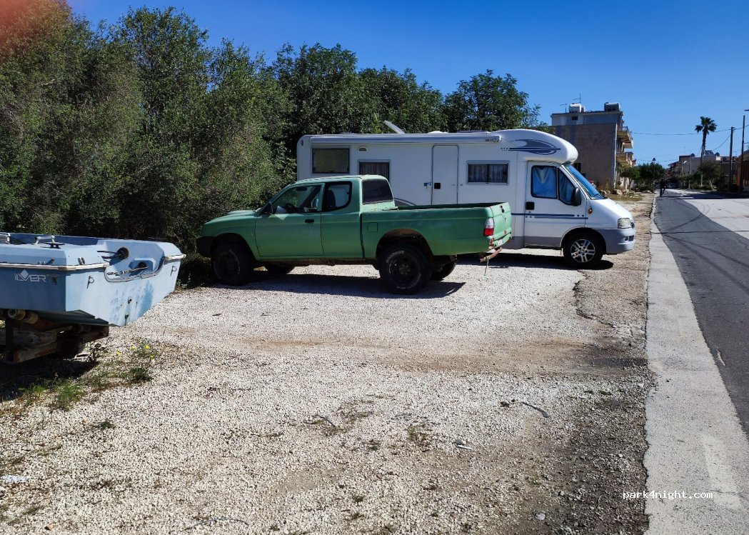 Parcheggio sterrato a bordo strada che conduce al porto. nessun servizio. illuminazione della pubblica strada. Strada non particolarmente trafficata alla notte. in 10 minuti si è nel centro del paese con vari negozi. Di fronte altro possibilità di parcheggio sterrato. il camper in foto è 7 m.