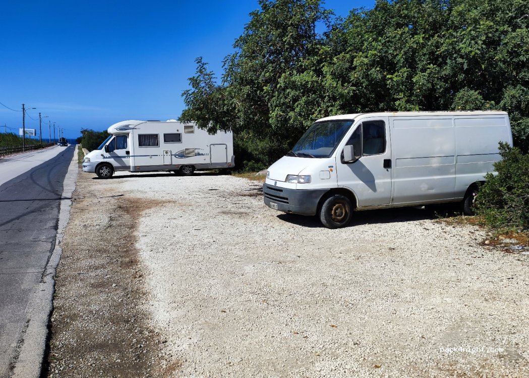 Unbefestigter Parkplatz am Straßenrand, der zum Hafen führt. kein Service. öffentliche Straßenbeleuchtung. Nachts ist die Straße nicht besonders befahren. In 10 Minuten sind Sie im Ortszentrum mit diversen Einkaufsmöglichkeiten. Vorne gibt es eine weitere Möglichkeit zum unbefestigten Parken. Das Wohnmobil auf dem Foto ist 7 m lang.