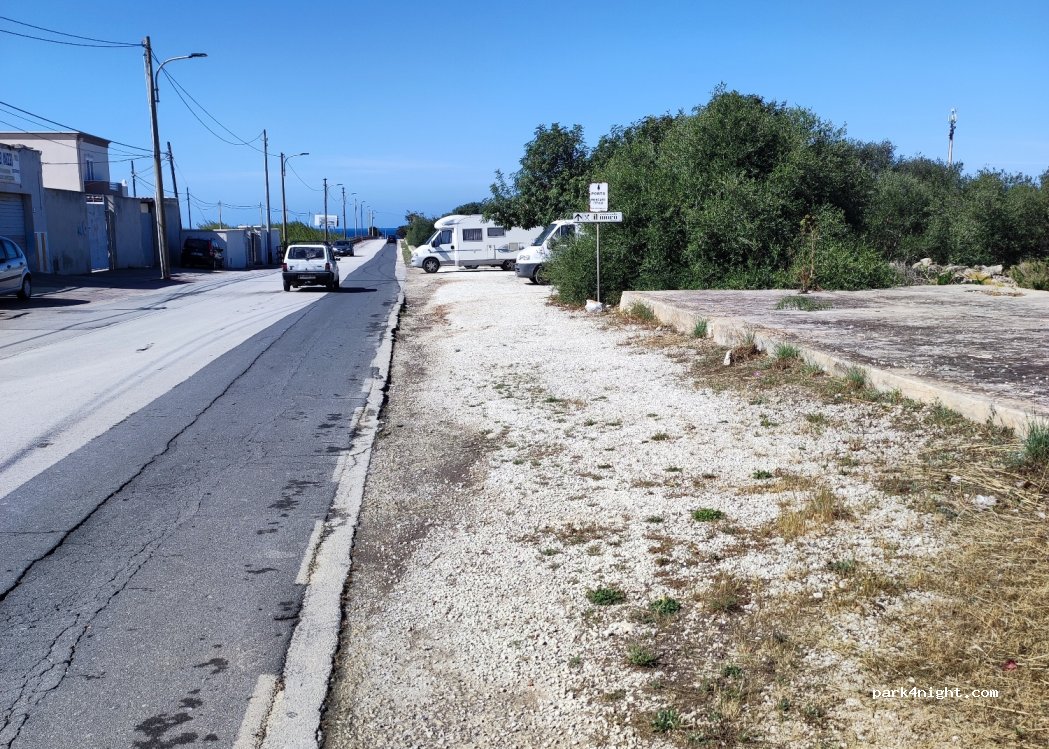 Dirt parking on the side of the road leading to the port. no service. public street lighting. Road not particularly busy at night. in 10 minutes you are in the town center with various shops. In front there is another possibility of dirt parking. the camper in the photo is 7 m.