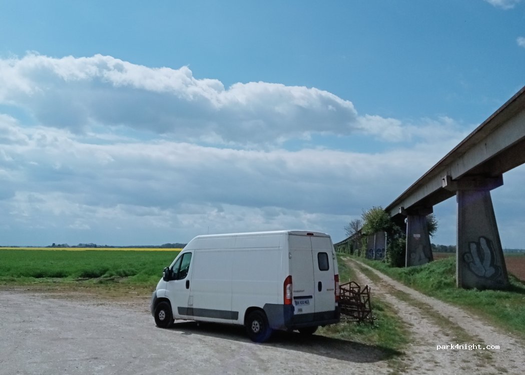 Parking agricole en plein milieu des champs et au pied de l'ancienne ligne d'aerotrain. Nuit calme et peu de passage. Les champs de Colza autour sont magnifiques au mois d'avril.