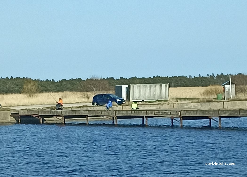 Geräumige Parkfläche. Viele Angler vom Steg. Hier befindet sich auch der Surfclub. Guter Spot zum Windsurfen.