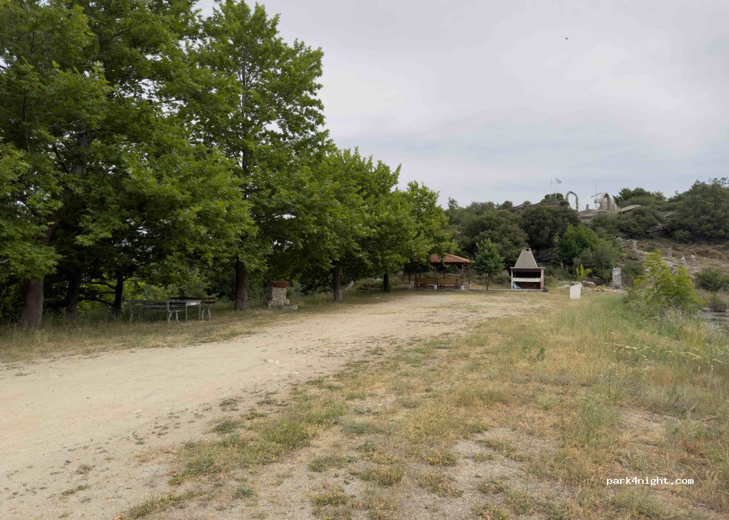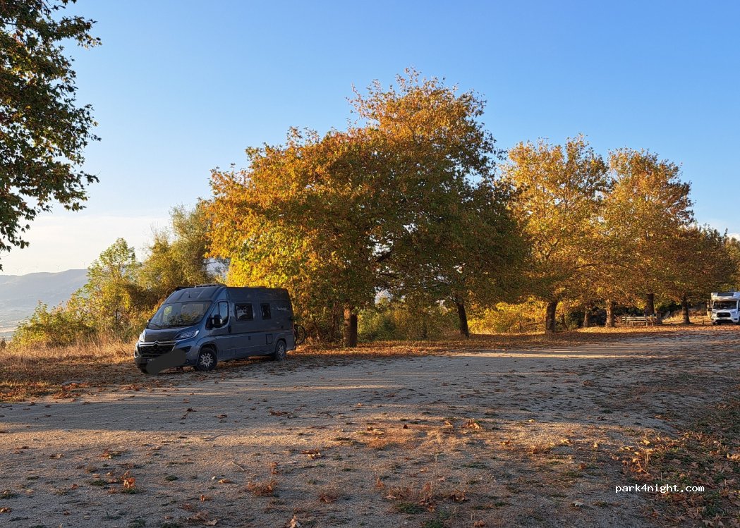 Beautiful place in the middle of nature by a small lake (water reservoir) and a great view of the valley. The access road is a paved gravel road and easy to drive on. Shade only in the afternoon, but tables under trees and a large grill. Drinking water tap with good pressure! 4G reception. Two waterfalls can be reached on foot (Artemis 5min, Kapnofyto 30min) and good for swimming. Very quiet during the week, rarely a few locals (they are all super helpful and many speak German). A few day tourists at the weekend but they don't stay long. There are also toilets in the village that can be opened on request.