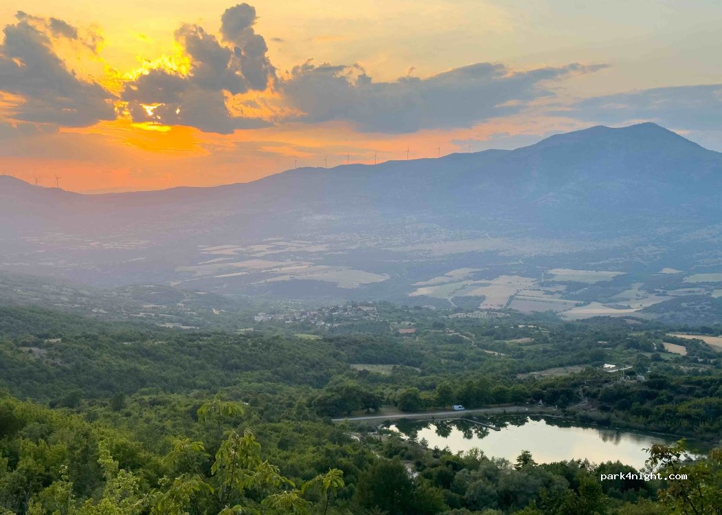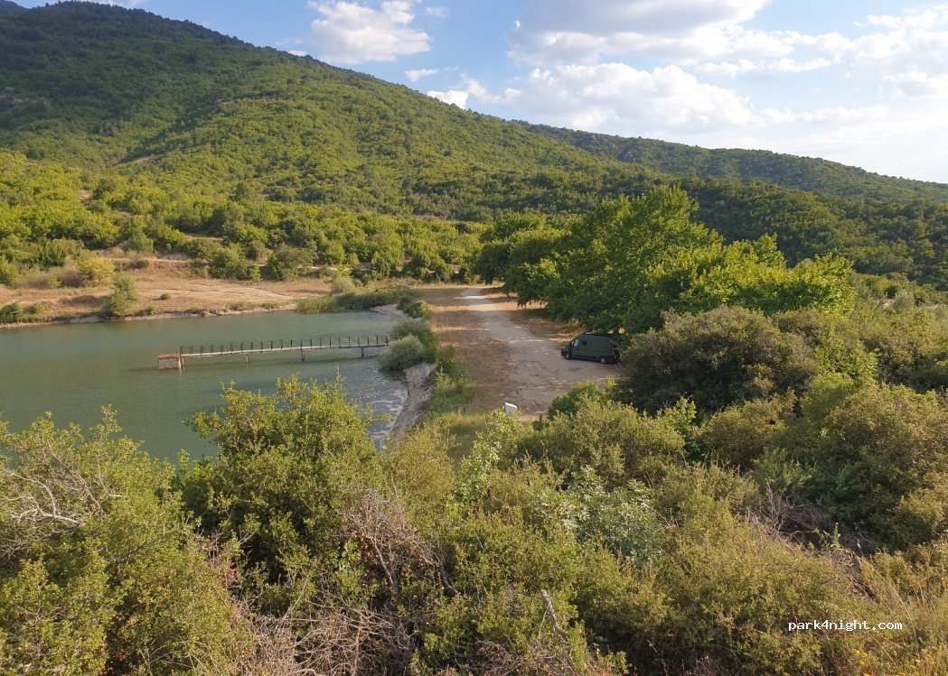 Bel endroit en pleine nature au bord d'un petit lac (réservoir d'eau) et une superbe vue sur la vallée. La route d'accès est une route pavée en gravier et est facile à emprunter. Ombre uniquement l'après-midi, mais tables sous les arbres et grand grill. Robinet d'eau potable avec une bonne pression ! Réception 4G. Deux cascades accessibles à pied (Artemis 5min, Kapnofyto 30min) et propices à la baignade. Très calme en semaine, rarement quelques locaux (ils sont tous super serviables et beaucoup parlent allemand). Il y a quelques touristes d'un jour le week-end mais ils ne restent pas longtemps. Il y a aussi des toilettes dans le village qui peuvent être ouvertes sur demande.