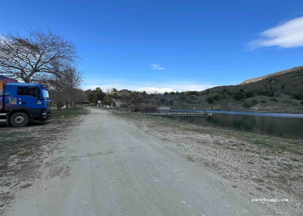 Schöner Platz inmitten der Natur an einem kleinen See (Wasserreservoir) und tollem Ausblick auf das Tal. Zugangsstraße ist eine befestigte Schotterstraße und gut befahrbar. Schatten erst am Nachmittag, aber Tische unter Bäumen und ein großer Grill. Trinkwasserhahn mit guten Druck! 4G Empfang. Zwei Wasserfälle zu Fuß zu erreichen (Artemis 5min, Kapnofyto 30min) und gut zum Baden. Unter der Woche sehr ruhig, selten mal ein paar Einheimische (sind alle super hilfsbereit und viele sprechen deutsch). Am Wochenende einige Tagestouristen aber die bleiben nicht lange. Im Dorf gibt es auch Toiletten, die auf Nachfrage aufgeschlossen werden.