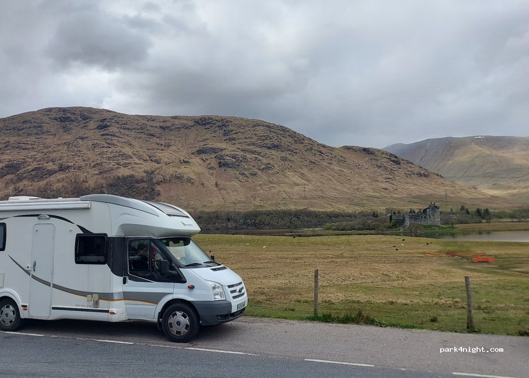 Parking au bord de la route avec vue sur le château de Kilchurn.