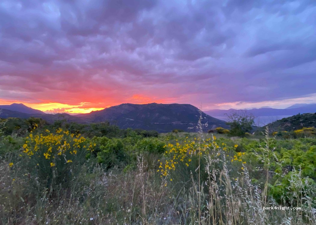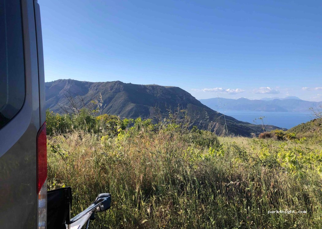 Bel emplacement à une courte distance de la route principale avec vue sur le détroit de Corinthe et un vignoble juste à côté. Un seul camping-car peut rester bien à niveau ici.