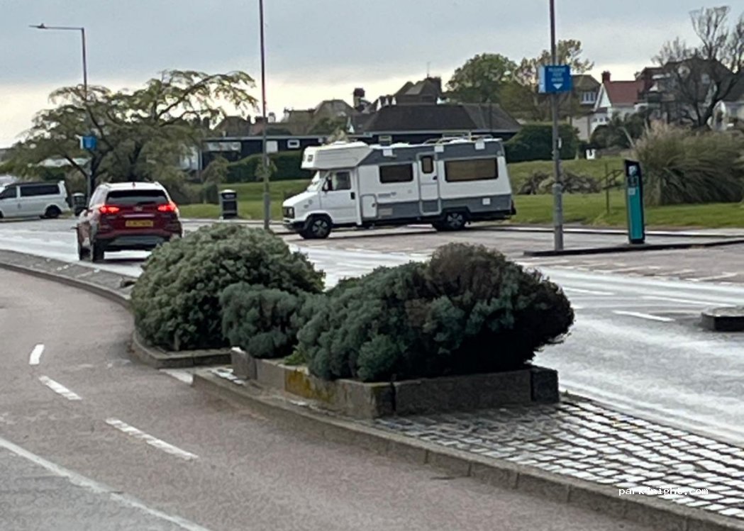 Our 6m motorhome was about longest possible. Looking out to sea. Grassed area behind. Currently signed as closed for for footpath works for October and November 2024. But 8 November no sign of any works impinging east end of car park.