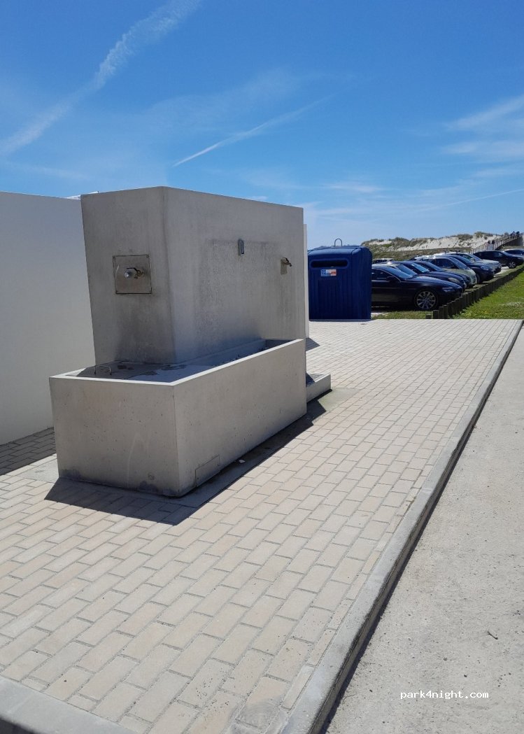 Mooie rustige plaats voor circa 20 campers die op 1 lange rij staan, op vlakke grasgrond. Zeer dicht bij de duinen en achterliggende zee, de branding is goed te horen. Prachtig zicht op de duinen en ondergaande zon. Nette faciliteiten voor lozen grijs en zwart water, alsmede voor het vullen. Betaalzuil was tijdens ons bezoek niet in gebruik dus alles was gratis.