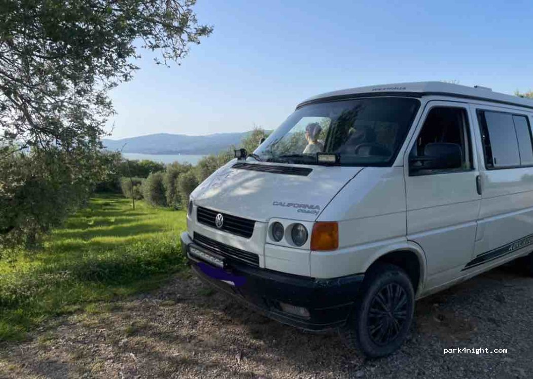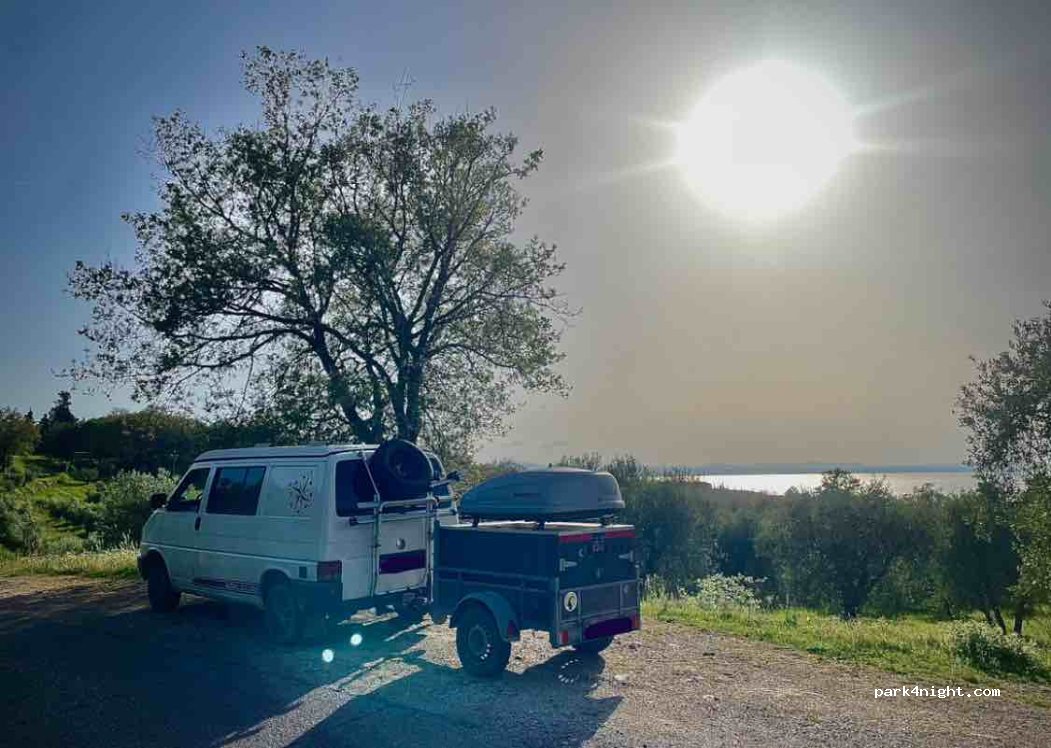 Eher ruhiger Straßenrand am Eingang zu einem Olivenfeld. Mit Blick auf den See und den Sonnenuntergang. Flacher Platz für ein kleines Fahrzeug (Van).