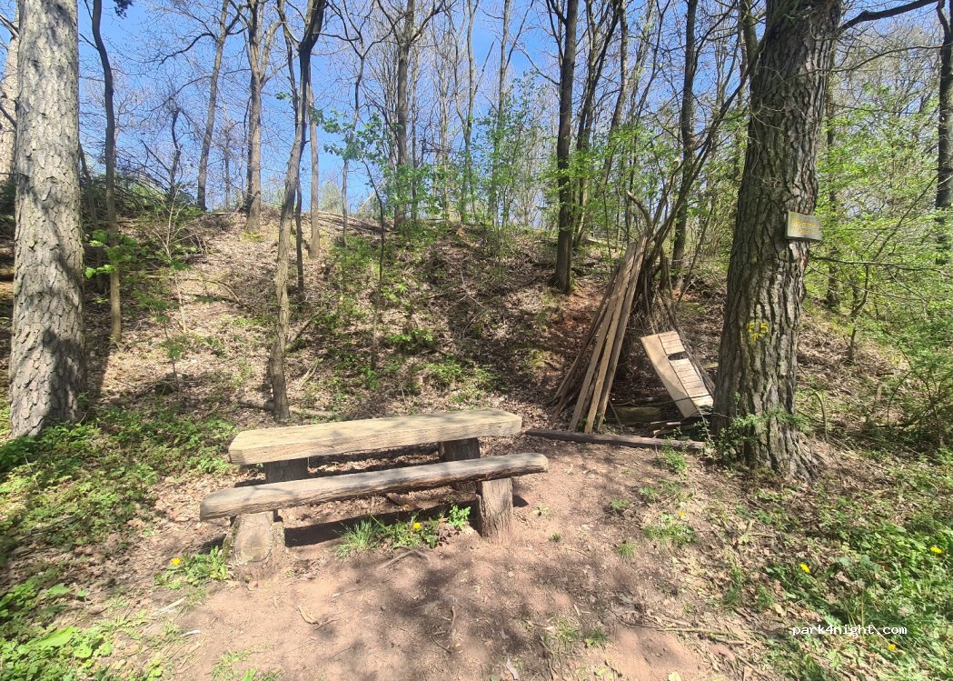 Small parking lot for hikers right next to a stream. Flat surface, gravel/earth. Wooden table with benches. Road can be heard from a distance. Approx. 5 spaces for parking diagonally up to a maximum of 6m. Narrower behind.