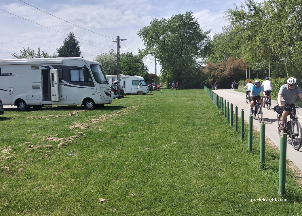 Stationnement dans le sens de la marche. Pour les véhicules d'une longueur supérieure à 5,50 m, un essieu repose sur de l'herbe solide.