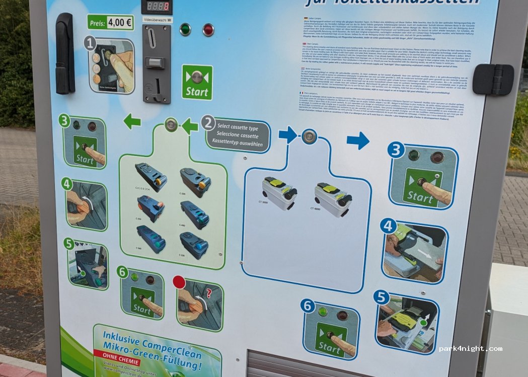 Eine normale Entleerstation wäre Sinnvoll. Das Gerät, macht die Kassette nicht leer. 4 Euro dafür ist für mich fragwürdig... wollte doch nur die Kassette leeren, was nicht geschehen ist... die Waschmaschine und Trockner sind Ortsüblichmit 14 €/Waschgang zu teuer. Wir sind nach Kleve weiter gefahren.
