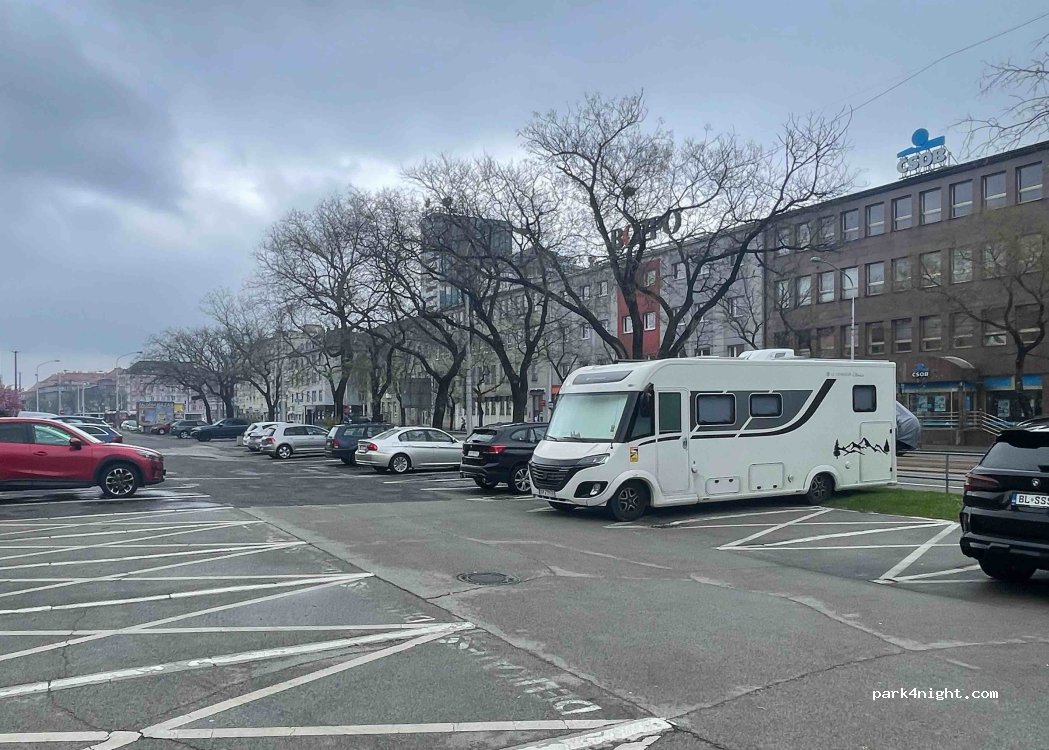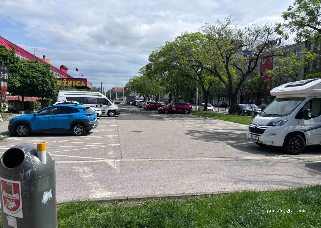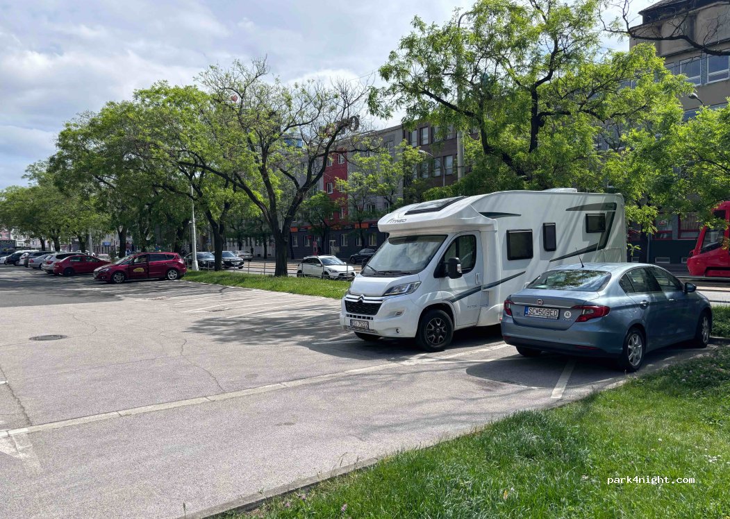 It's an ideal parking spot for exploring the city. It's secure. The city center is a 10-15-minute bike ride away. Parking costs €1.50 per hour. You enter and exit through the barrier. You buy a ticket at the entrance. You scan it at the exit and pay with your credit card. It's noisy because it's on the roadside. I spent the night elsewhere.