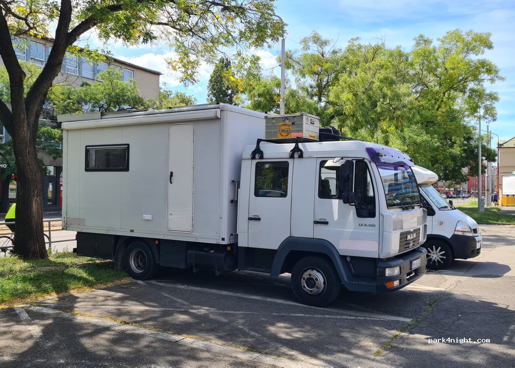 Good place to stay. We were there with a 7,5m long, 3,3m height and 7,5t Camper truck - this is possible. see picture of the white MAN Truck. The exit might be impossible for such a truck if the parking lot is fully occupied.