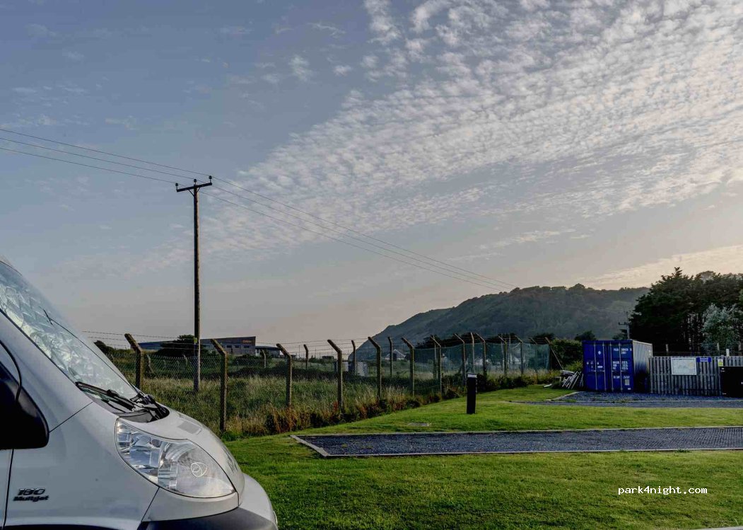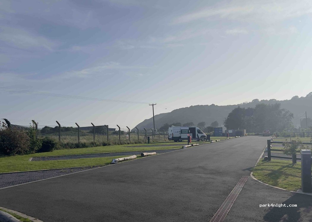 Location is great 2 minute walk to beach and centre of town we had a quiet night sleep ok it’s £25 per night with electric hook up and there is no shower or toilet block but you can empty your black water and grey water via a bucket only and fill up with fresh water only 10 very well maintained spaces available