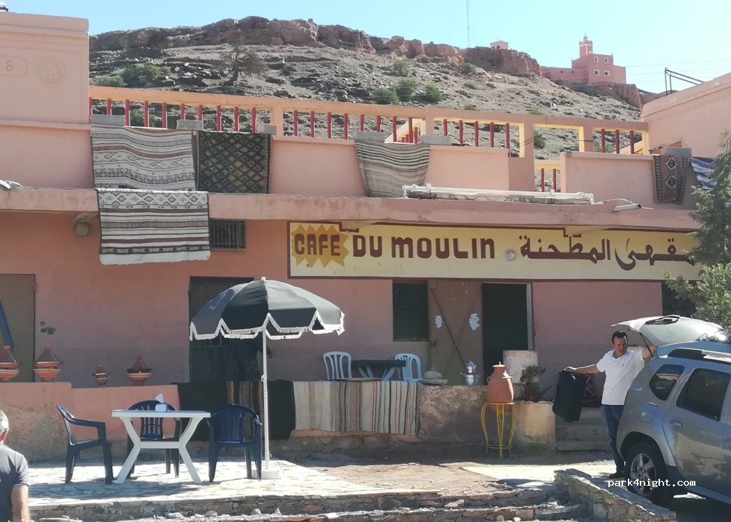 L'hospitalité de Brahim en ce lieu est à nouveau à l'honneur. À la fois propriétaire du Café du Moulin et guide pour la visite de l'Agadir d'Ighir Ifran, cet endroit mérite qu'on s'y arrête. Le stationnement est gratuit. Il n'y a pas de service. Brahim informera les autorités compétentes du secteur de votre présence pour la nuit et ainsi vous pourrez y rester sans problème. Nous recommandons