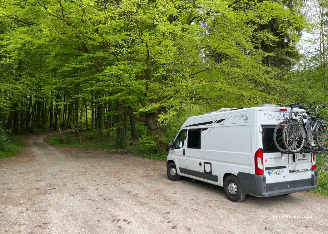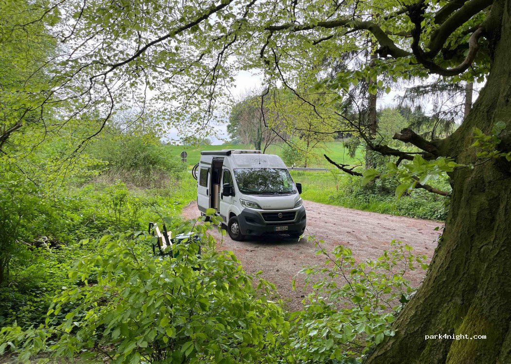 Kleiner breiter Platz auf einem Waldweg vor einer Schranke. Zwar dicht an der schmalen Landstraße, damit hört man diese aber wunderschön im Wald gelegen. Platz für 2 Wohnmobile!