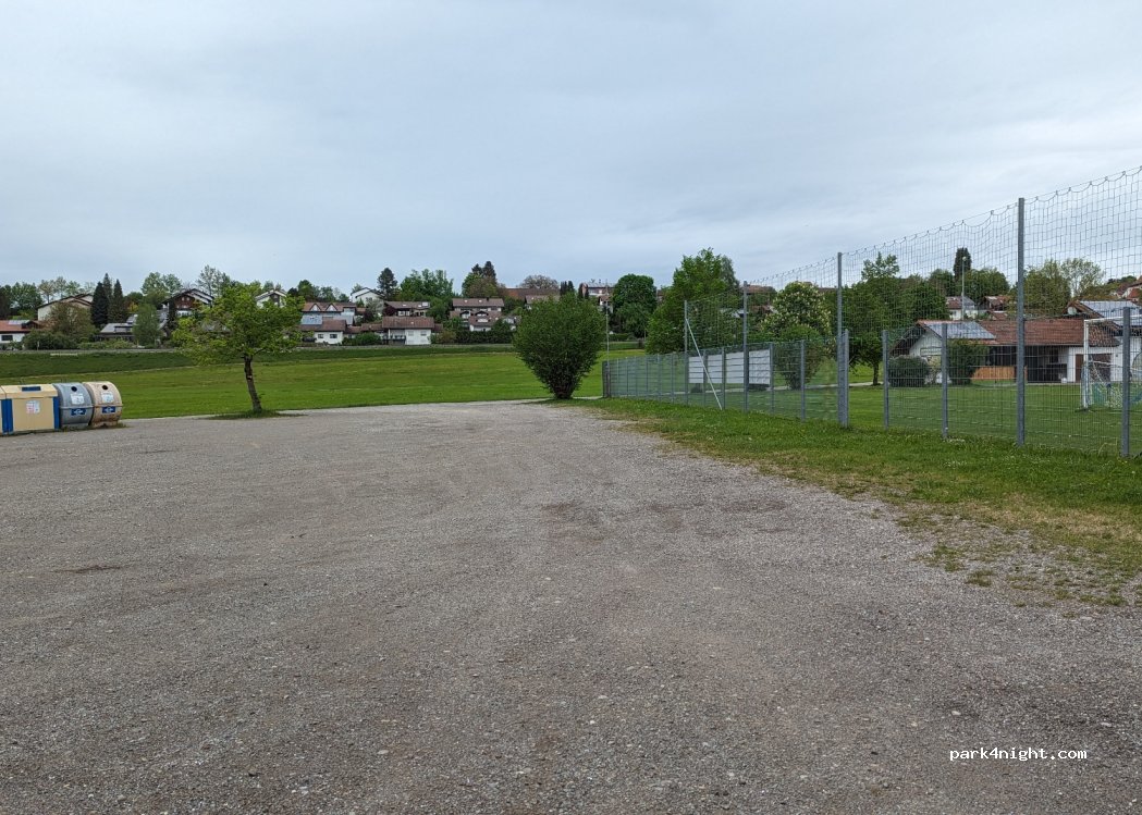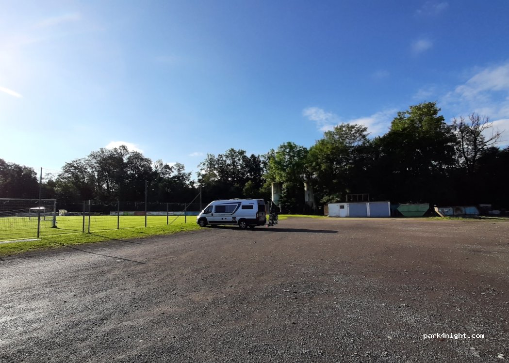 Flacher Schotterparkplatz gegenüber dem Fußballstadion. Ideal für eine ruhige Nacht.