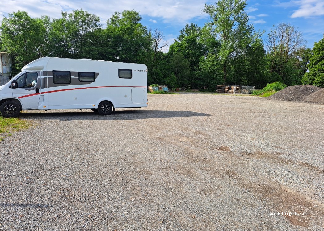 Nuit calme, nous avons bien dormi. Seule la visite du camion-poubelle le matin, mais sinon agréable pour passer la nuit. Terrain assez plat.