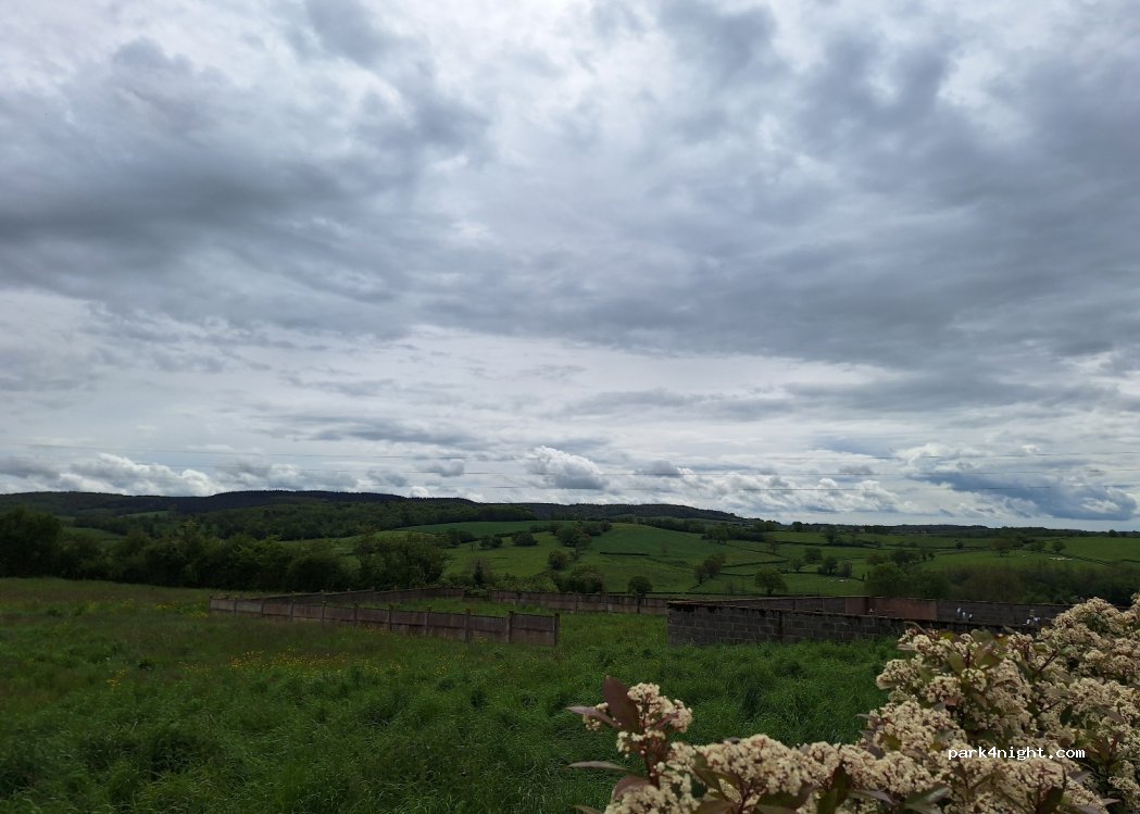 Free parking with gravel floor. In the town center. No parking ban. View of the countryside and close to an orientation table. Very calm. No service. Only glass and paper recycling.